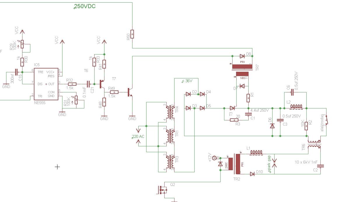 Darbai uzpuole ir sueda visa laika... Susirinkau schema pagal pateikta zemiau brezini tik iki optiniu izoliatroriu deja. Prasitestavau, viskas veikia. Is dvigubo operacinio stiprintuvo LM358 iseinancio signalo ploti galima paderinti. Tai pamaniau galima ir HV iskrova suderinti kartu su tiristoriaus junginejimu ir panaudoti puslaidininki junginejimui, o su spark gapu iskrova butu tik uzkurimui.