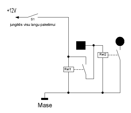 Arba gali statyt i kiekvienas dureles po rele,turincia du kontaktus,kuriuos pajungsi lygiagreciai gamyklinio jungiklio kontaktams-tada is kiekvienu duru reikes isvest i viena bendra taska tik po viena laida,kuris jungines ta rele,bet uztai reikes ardyt visas keturias duris ir kiekvienose sumontuot po rele.
