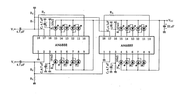 LM3916 lygio (VU Meter) indikatorius (-20 iki +3db); iš esmės, tas pats, kaip LM3915. |