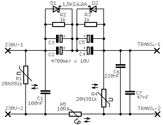 Prie ko čia tie transilai ? Transilai šioje schemoje tik sukuria pakenčiamas darbo sąlygas elektrolitiniams kondensatoriams. Ir tai yra visa jų misija. Dar daugiau birbimą sumažintų nebent LC filtras. Tik klausimas ar jis pats nebirbtų. |