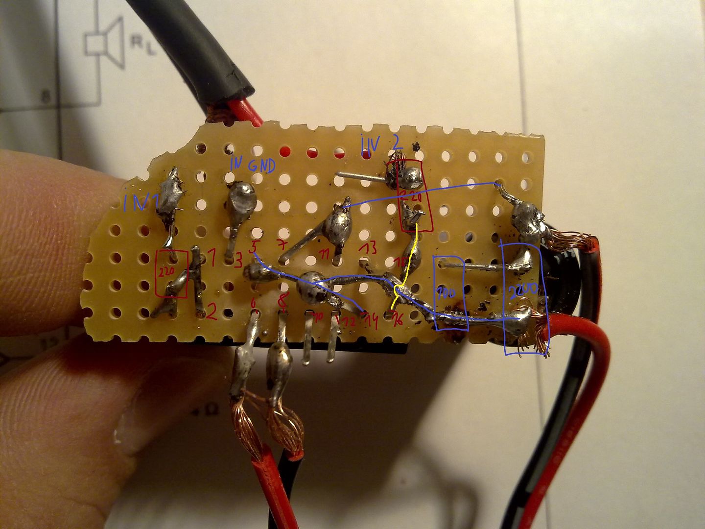 | sulituota pagal shema , tai kur klaidos gali būti ? 1,2 iėjimas , 17,16 iėjimas , 3 įėjimo žemė , 14,5,13 maitinimo pliusas , 7,11 minusas , du kondikai tarp pliuso ir prie minuso , tai kur ? |