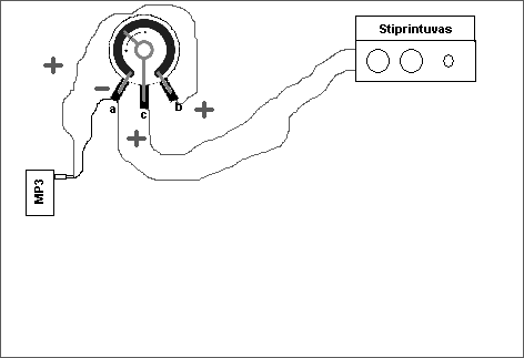 Kitą kanalą jungti analogiškai. Potenciometras geriau logaritminis. Kolkas nesigilink į šito žodžio reikšmę, tiesiog paprašyk parduotuvėj kad duotų būtent tokį. |