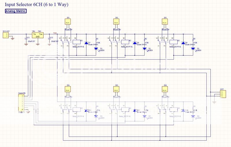 | Labai paprastai - maitinimas / pvz 10-15v/ toliau stabas 7805 , + eina iki galetniko centr. kontakto ir is jo iki rele.Visos reles stovi prie IN lizdu/ gali ant maketines PCB/ kiekviena rite rele suntuojam su diodu 1N4148 ; minusines galus reliu /GND/jungiam i viena linija ir iki - maitbloko vienu laidu /7805/.Nuo galetniko darom "zguta" is plusiniu laidu ir traukiam iki PCB kur stovi reles.BUTINAI reikia sujungti GND reliu ir Signal.GND su resiku 10-47 Om. Visi RCA gnd sujungti i viena linija, nuo centriniu kontaktu RCA iki reliu-laidukais, isejimai is reliu irgi jungiam i viena linija - viena L kanalas, kita R kanalas ir Sign.GND. Nuo galetniko kontaktu per resistoriu galim prrijungti LED-us / laisvus galus i viena kruva ir su vienu laidu iki - maitbloka (7805). Stai ir viskas. |