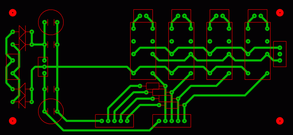 | Kadangi komutuojamas signalas labai silpnas-reikalingos signalines reles /pvz Axicom is tv komunikacjos sferos/; kitaip bus R tarp kontaktu; tavo rele man atrodo ne signaline. Diodas reikalingas. Resistoris GND rele ir GND sign reikalingas irgi, kitaip gali atsirasti fonas ir "bum" jungiant rele. Prie stabu pridek dar po 0.1uF kondensatorius. Dar del tavo PCB-galima det tik 1 resistoriu nuo led-u iki /-/ , o 4 resistorius pakeisti i "peremickes". |